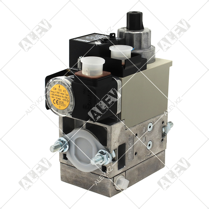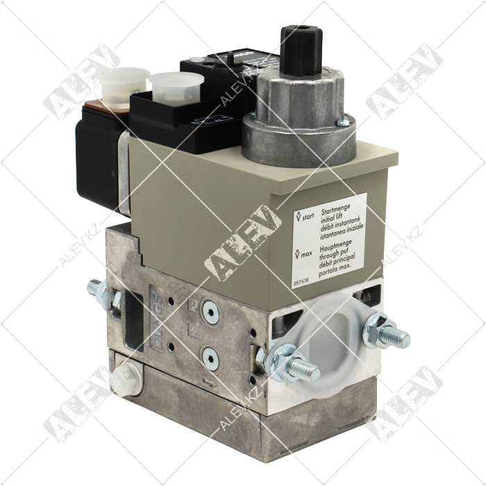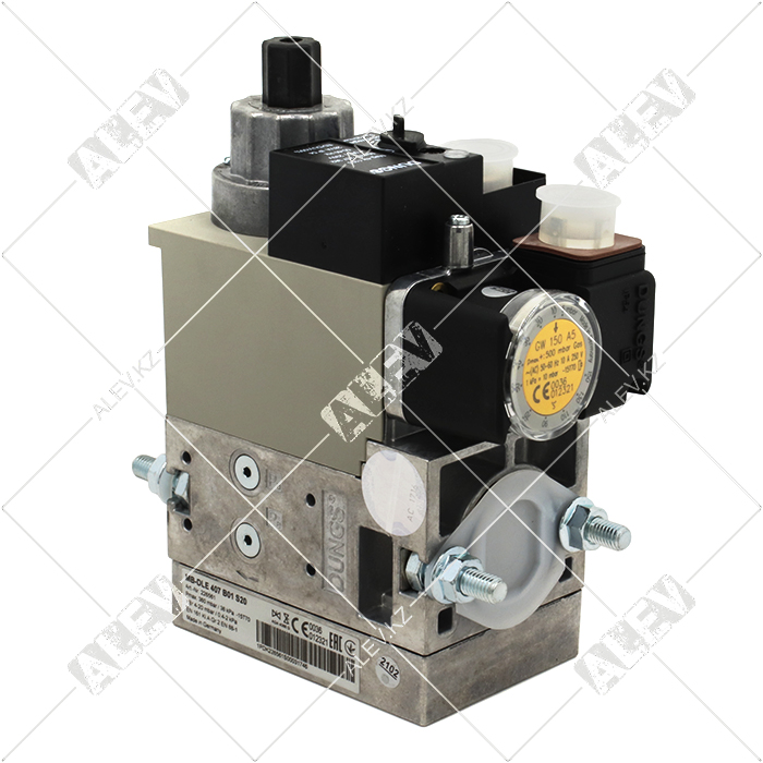 В корпусе компактного одноступенчатого газового мультиблока Dungs MB-DLE 407 B01 S20 расположены два быстрозакрывающихся клапана, с электромагнитным приводом постоянного напряжения, с совместным управлением. Первый клапан, класс А, группа 2, быстрооткрывающийся. Второй клапан, класс А, группа 2, медленно открывающийся, скорость подъема и дроссель основного расхода газа настраиваются до необходимых значений при наладке горелки, что обеспечивает плавный запуск горелки. Регулировка давления на выходе осуществляется интегрированным регулятором. На входе газа установлен фильтр грубой очистки (установка основного фильтра строго обязательна). Для предотвращения запуска и работы мультиблока при отсутствии необходимого давления в магистрали, на корпусе размещен датчик-реле Dungs GW А5.